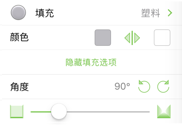 可旋转高亮颜色(右侧的颜色样本)的位置;您也可以轻按两次角度数值,然后输入一个特定值。 - 斜切高度:向左拖动滑块使对象/版面上的斜边更平贴;向右拖动使斜边更高。